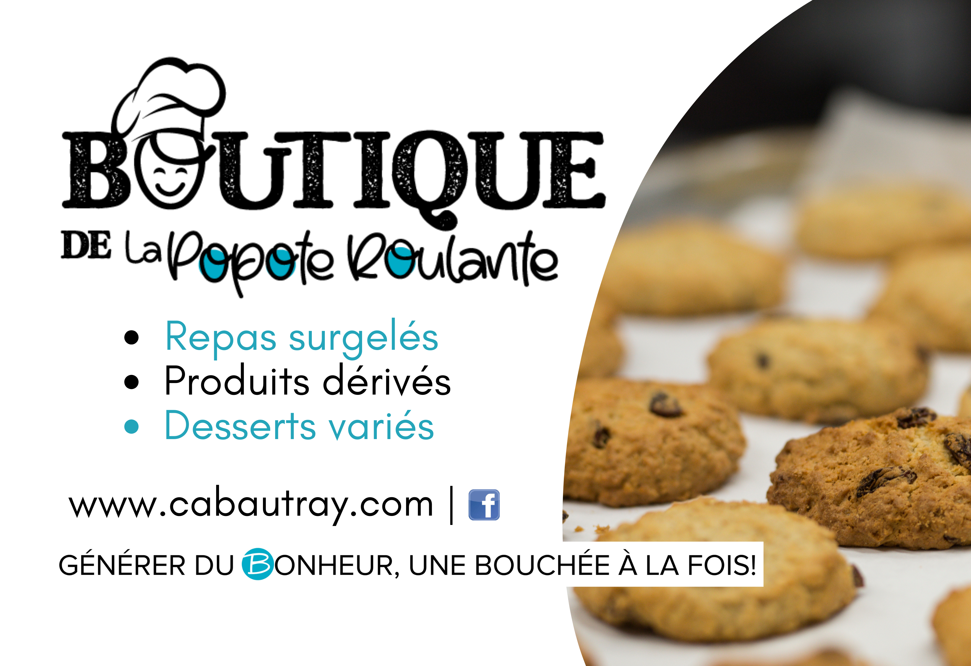 Description du serviceSituée dans les locaux du Centre d’action bénévole D’Autray, la boutique de la Popote roulante du CABA, offre une gamme variée de repas faits maison congelés, pour satisfaire tous les goûts. Que vous soyez un client régulier ou que vous souhaitiez découvrir nos produits, notre boutique est ouverte à tous. Vous y trouverez entre autres :